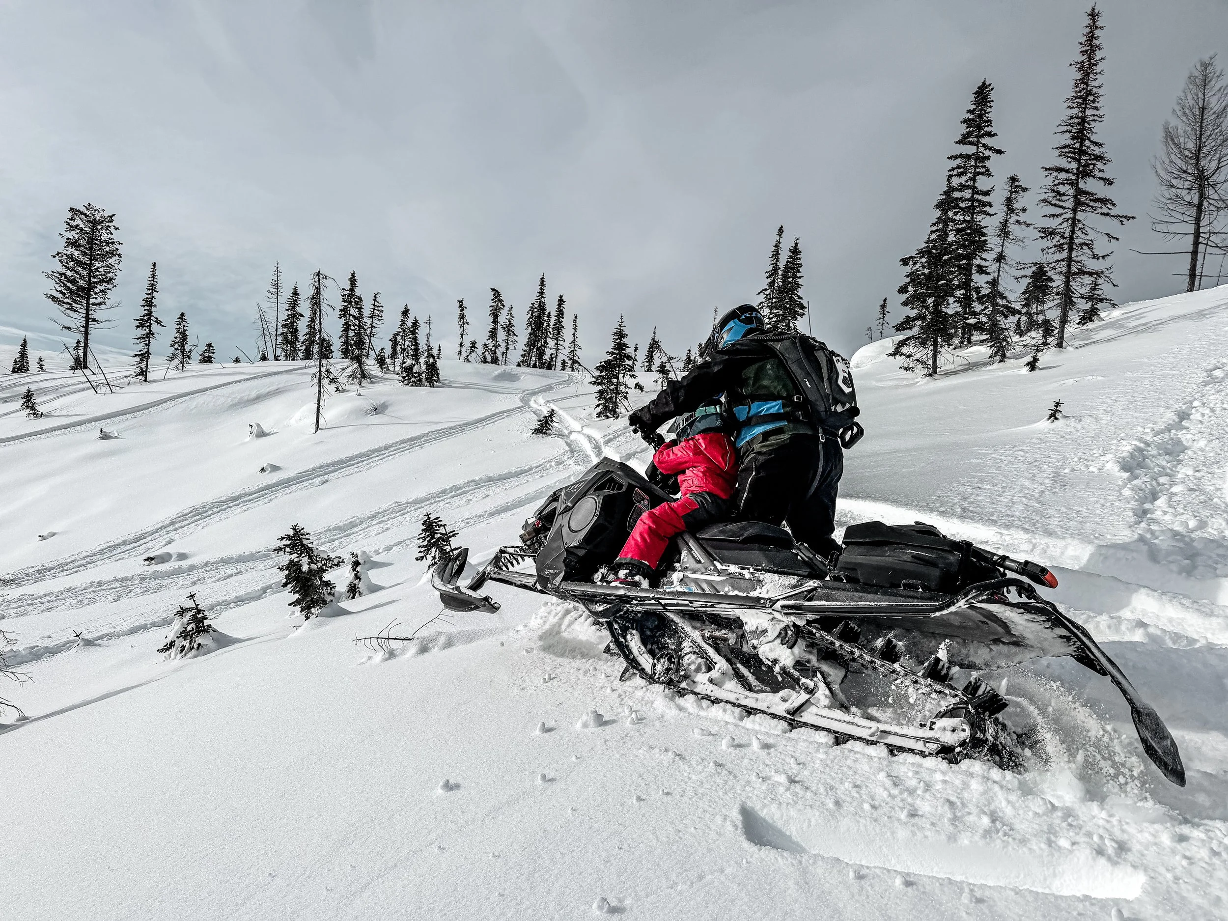When it came time for his own 120 sled, we focused on building skills before terrain. Fields became our training ground for starting, stopping, and turning. One deep backyard powder day ended with a kicked sled and a tossed helmet — a lesson in patience and ‘big feeling’ problem solving that every rider eventually learns (right?). Those short laps eventually turned to longer days riding squirrel up the mountain and into simple mountain terrain.